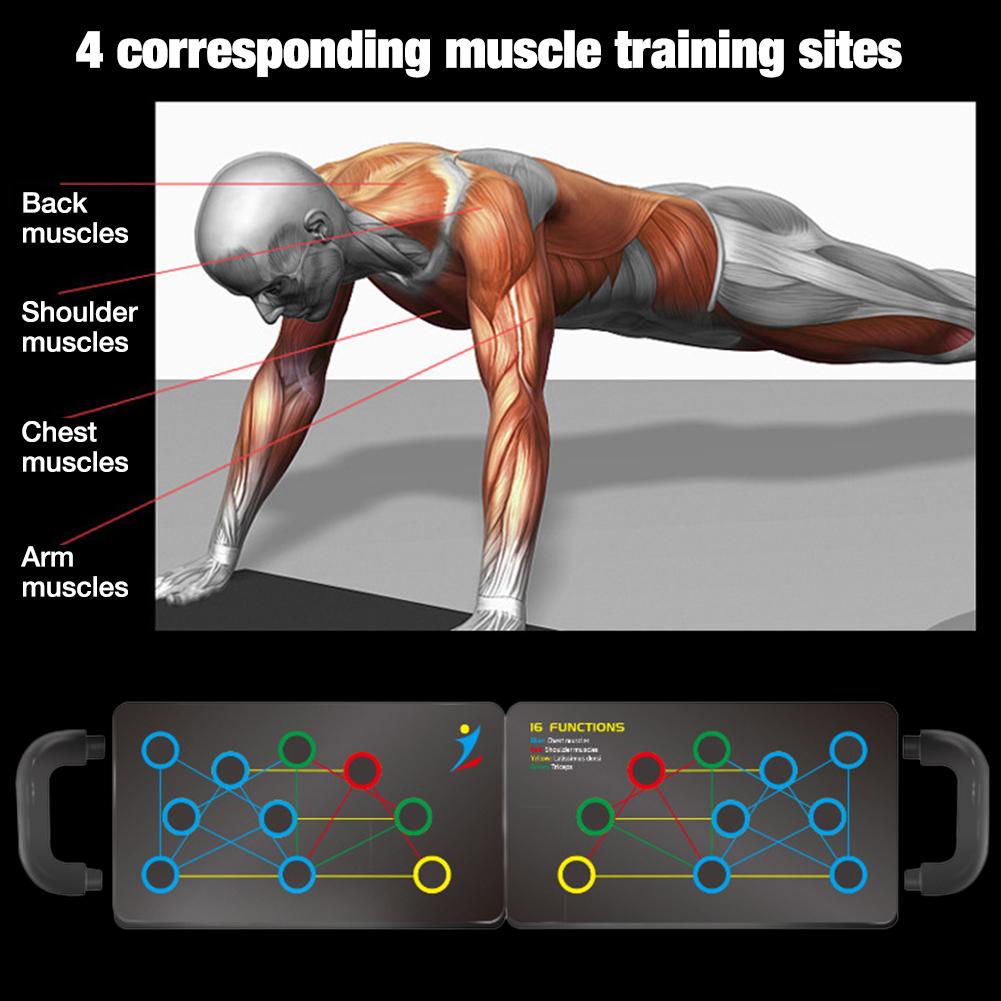 1.16-in-1 Push-Up Board: The push-up boards features the various color codes, which are used for specific muscles, chest muscles and abdominal muscles, arm muscles and latissimus dorsi, chest (blue), shoulders (red), back (yellow), triceps(green).